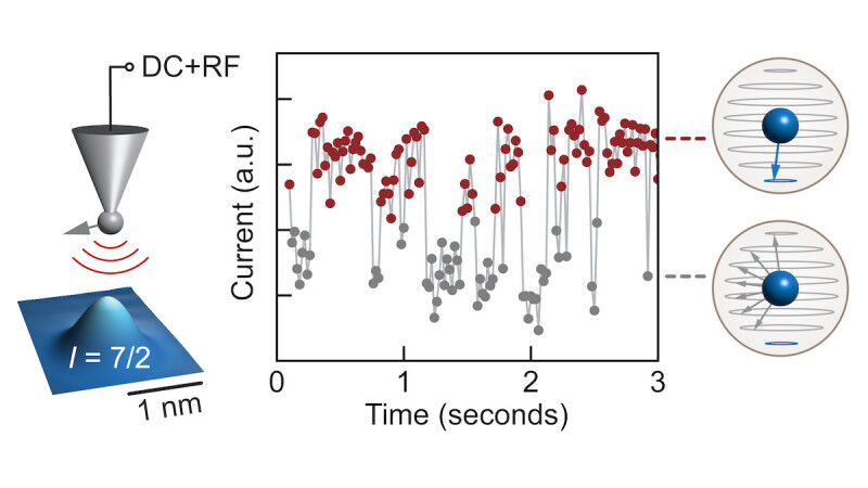 Grafische samenvatting van het experiment. Een spanningssignaal wordt via de STM-naald naar een atoom gestuurd met een nucleaire spin. De frequentie van dit signaal komt overeen met de energie van slechts 1 van de 8 quantumtoestanden die de nucleaire spin kan innemen. In de loop van de tijd schakelt de stroom die door het atoom loopt tussen een hogere waarde (rood) en een lagere waarde (grijs), wat respectievelijk laat zien dat de nucleaire spin zich in de geselecteerde quantumtoestand of in een van de andere 7 toestanden bevindt. De spin blijft gedurende een aanzienlijke fractie van een seconde in dezelfde toestand. In een meer gecontroleerde versie van het experiment bleek de nucleaire spin tot wel 5 seconden stabiel te zijn.